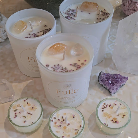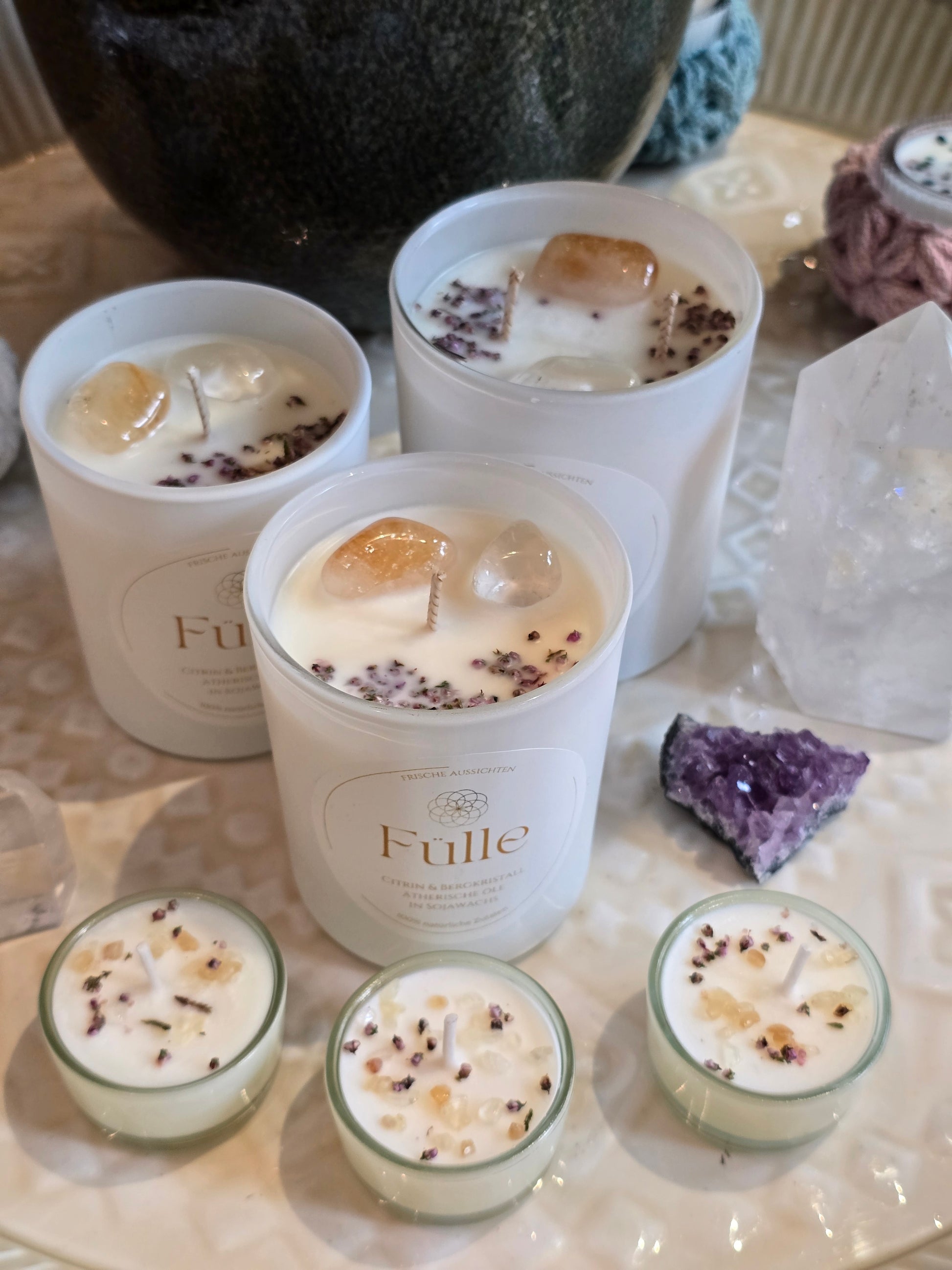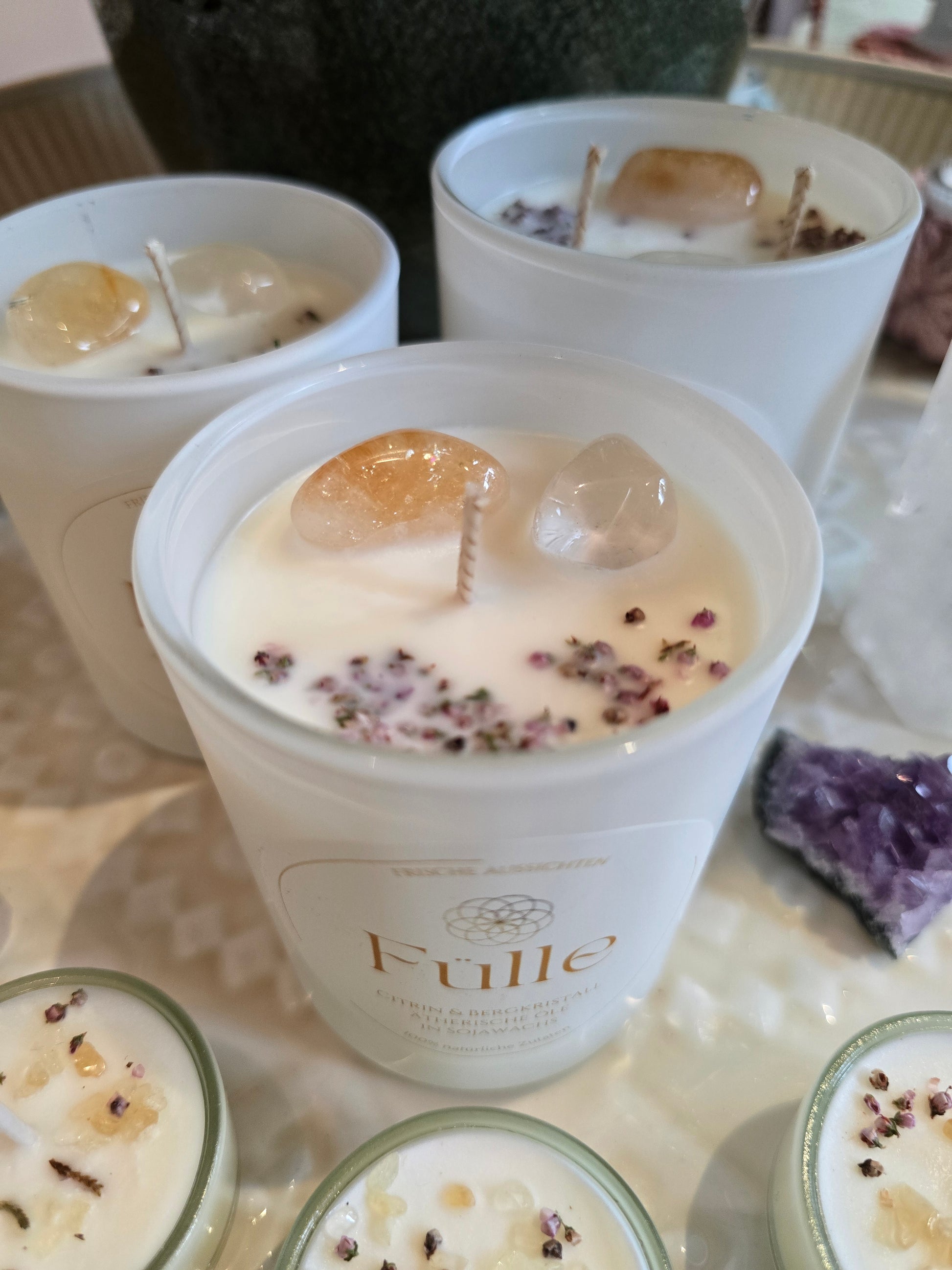 Mit sehr viel Liebe zum Detail aus Sojawachs handgefertigte Kristallkerze mit den Kraftsteinen Citrin und Bergkristall.