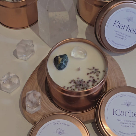 Mit sehr viel Liebe zum Detail aus Sojawachs handgefertigte Kristallkerze mit den Kristallen Apatit und Bergkristall und hübschen Erikablüten dekoriert. Jede Kerze ist ein Unikat!