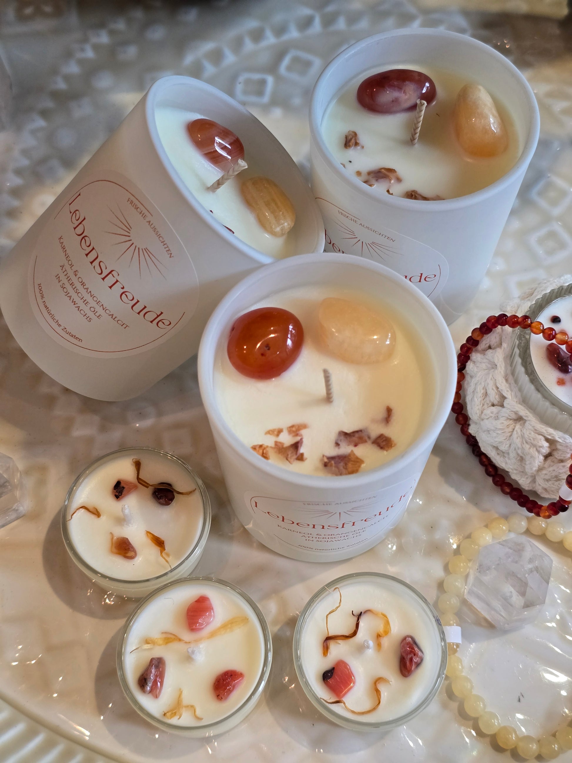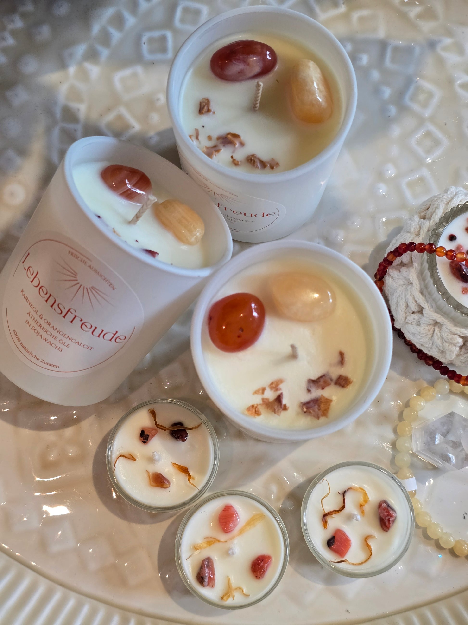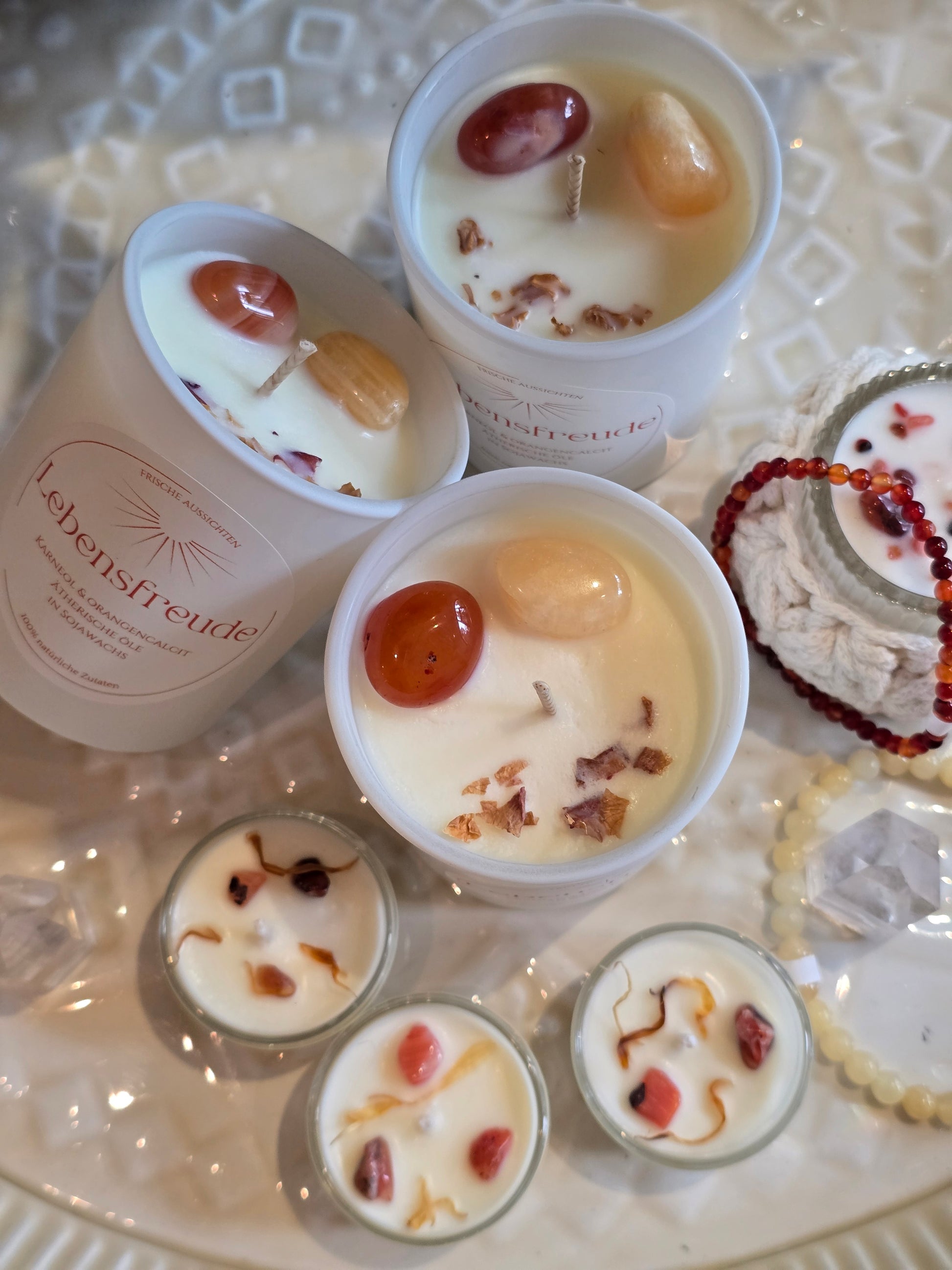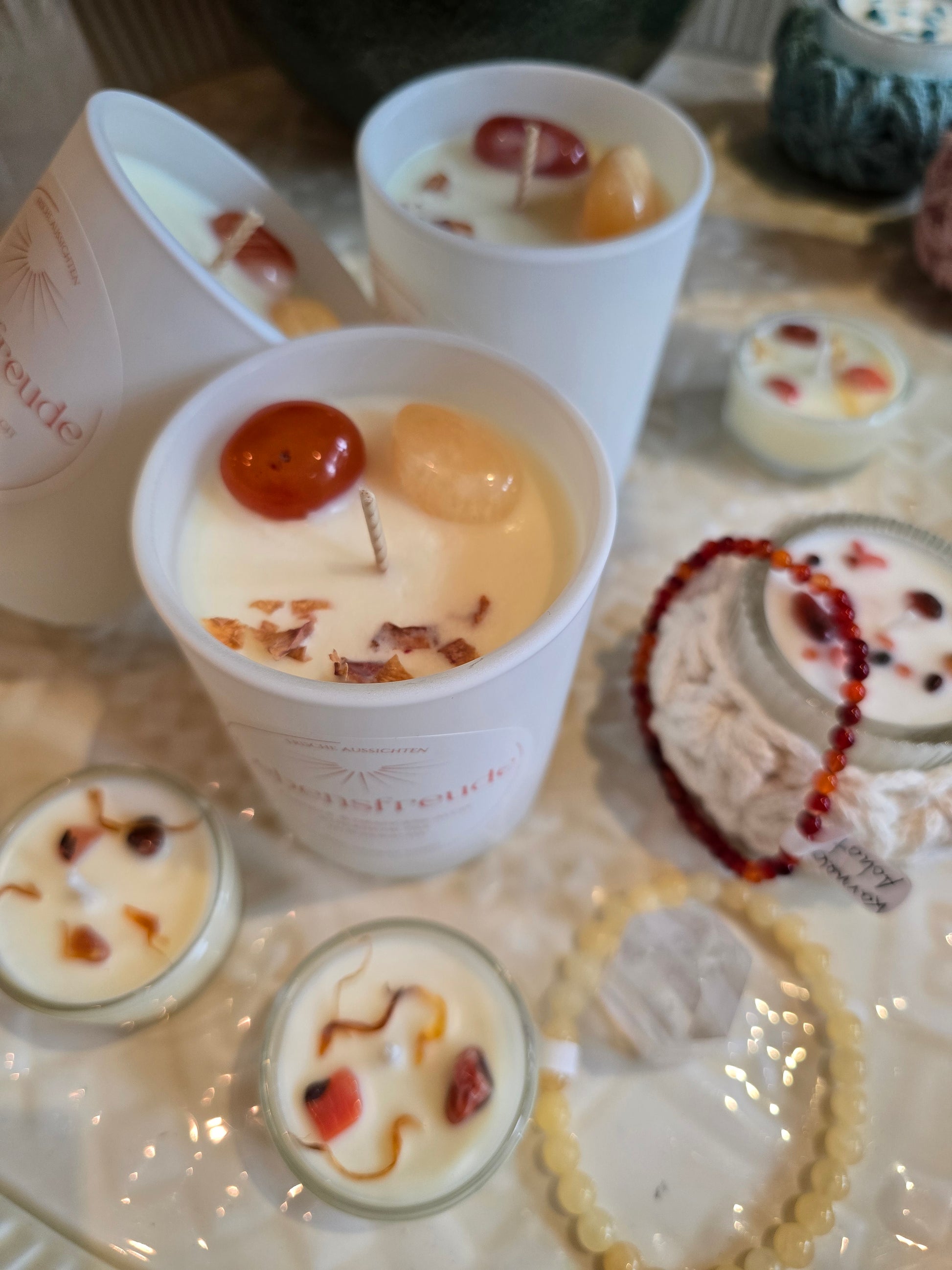 Mit sehr viel Liebe zum Detail aus Sojawachs handgefertigte Kristallkerze mit den Kraftsteinen Karneol und Orangencalcit.